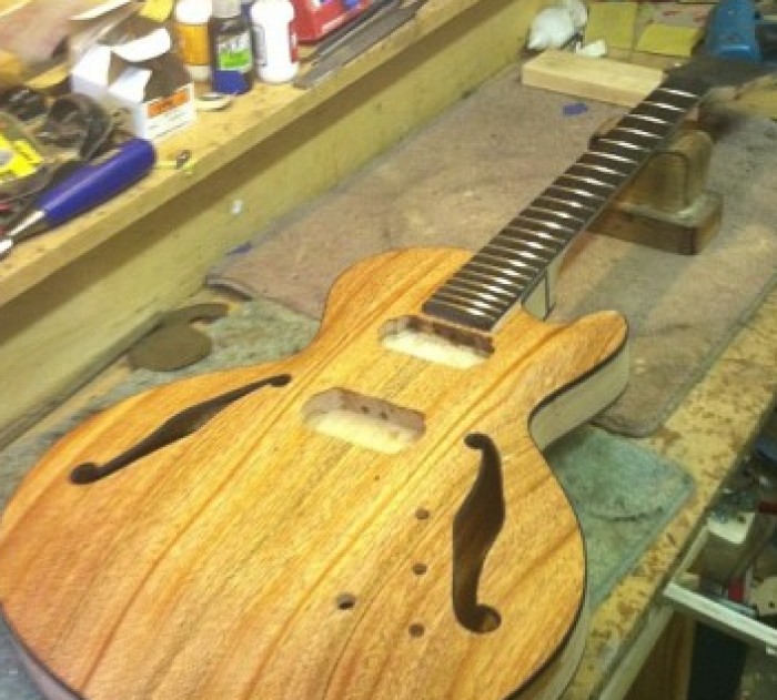 My interest in guitar building started at age ten when my guitar teacher showed me an instrument that had just been built for him. I was astounded by the concept of a custom, hand-built guitar. From that moment, I knew I wanted to pursue a career as a luthier. When I was fourteen, with much help from Mark Johnson (the luthier who had made my guitar teacher’s guitar), I made my first guitar. Really, Mark did most of the important stuff and I pieced the parts together. The experience only solidified the idea that I was to become a luthier.